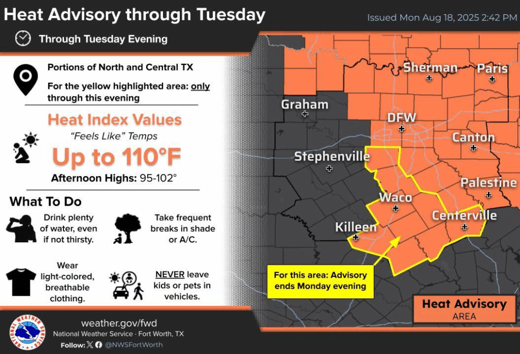 Another hot and humid day is expected on Tuesday, where parts of DFW could reach 100-102 degrees. A Heat Advisory remains in effect through Tuesday evening for much of North and Central Texas. Heat Index temps could reach 107°–110°F, with afternoon highs between 95°F and 101°F. There is a small chance of storms in North Texas, with some storms producing locally heavy rain, gusty winds, and frequent lightning.
